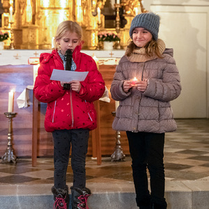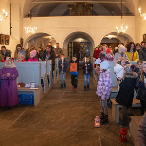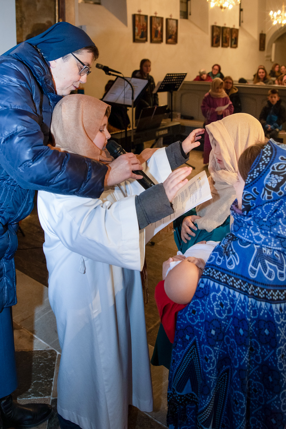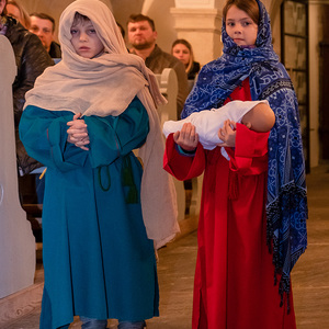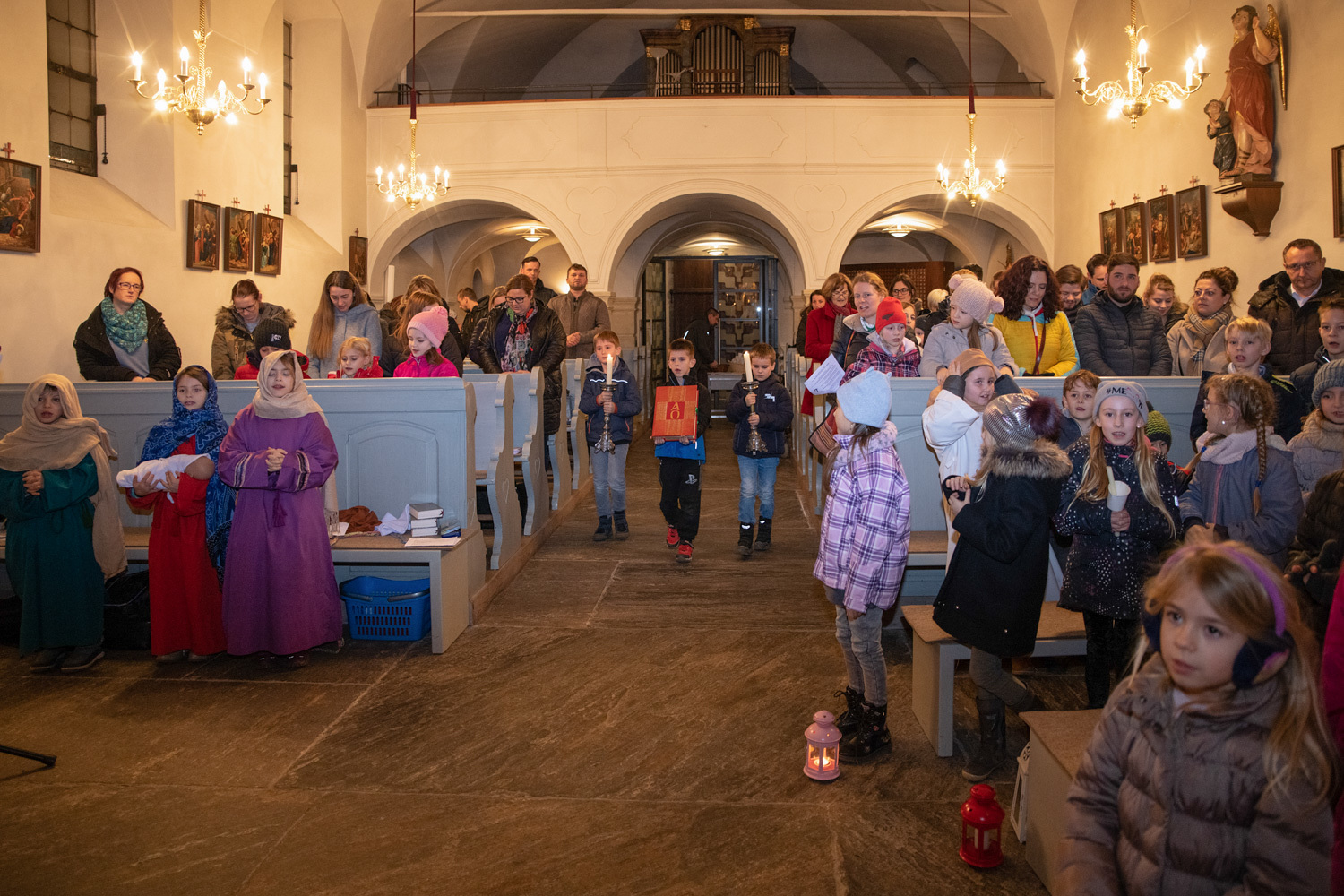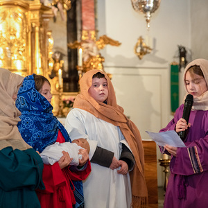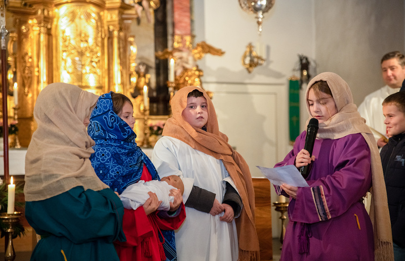 Die Kinder spielten die bekannte Bibelstelle aus Lukas 2,22–40, wo Maria und Josef mit dem kleinen Jesus in den Tempel kommen, das Kind Gott weihen.