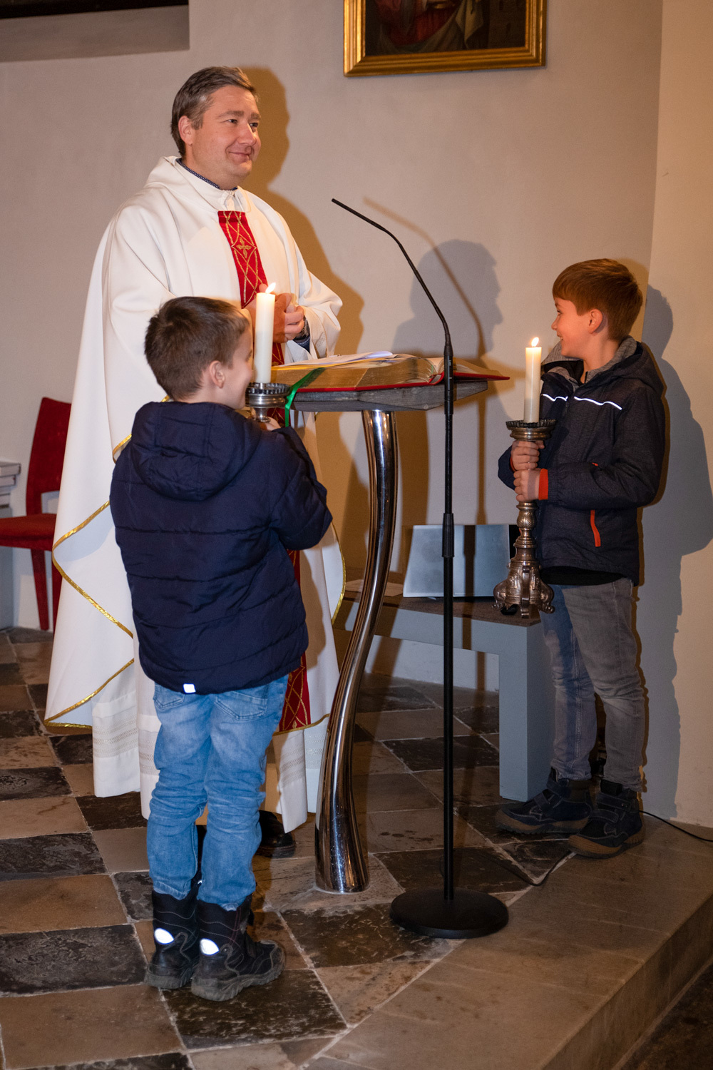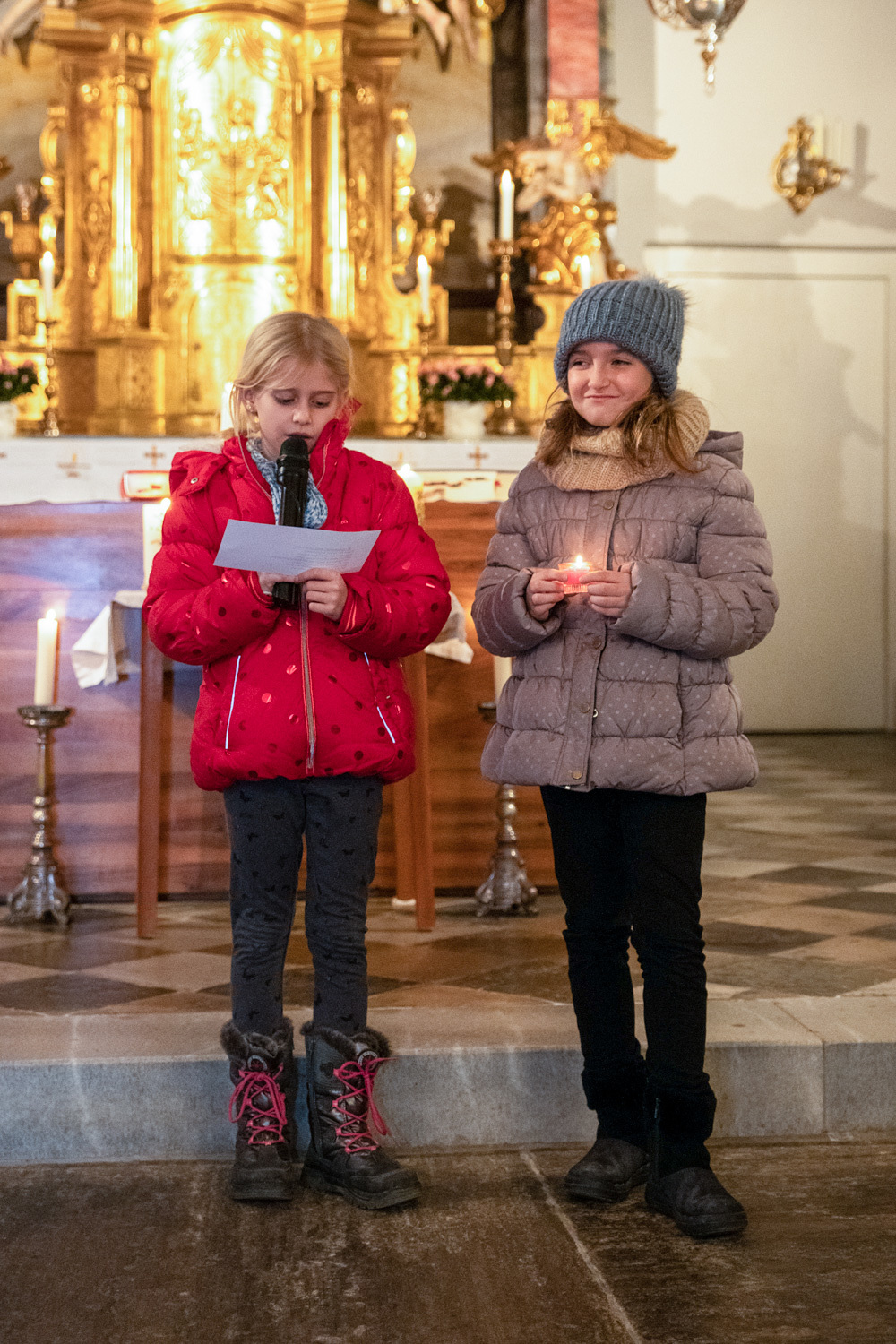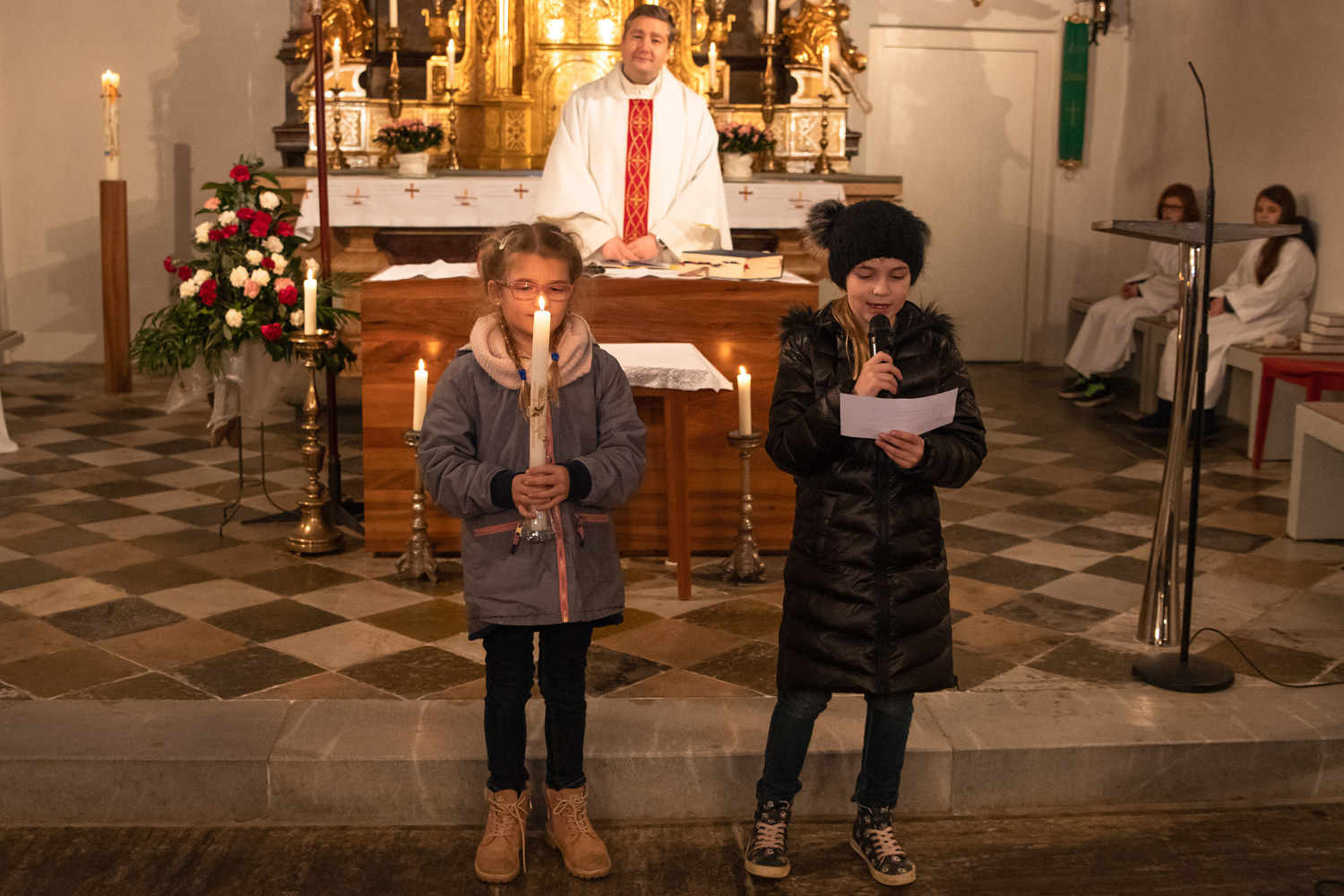 Die Kinder spielten die bekannte Bibelstelle aus Lukas 2,22–40, wo Maria und Josef mit dem kleinen Jesus in den Tempel kommen, das Kind Gott weihen.