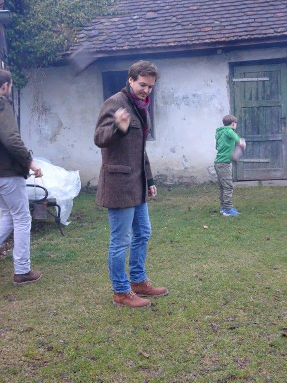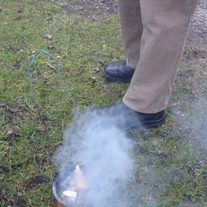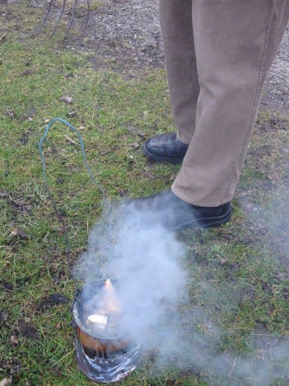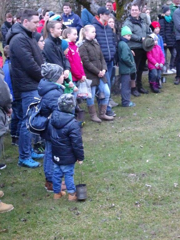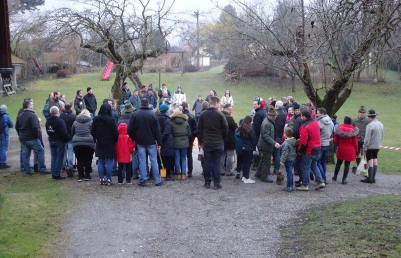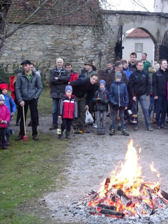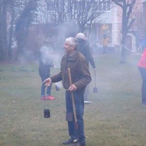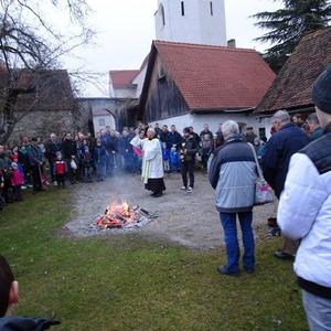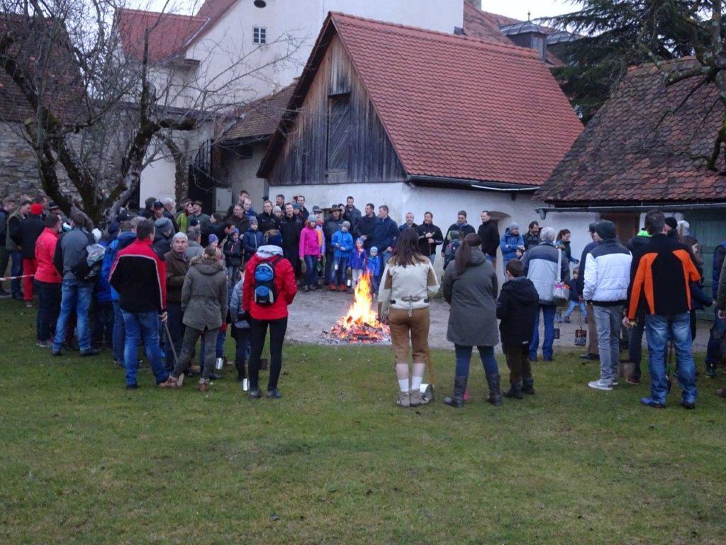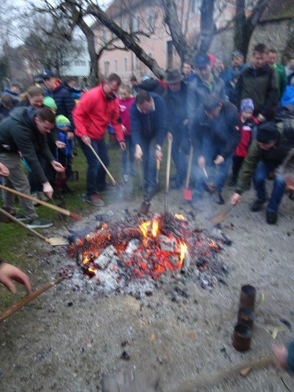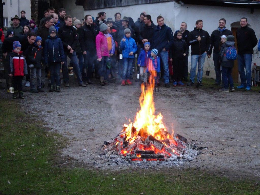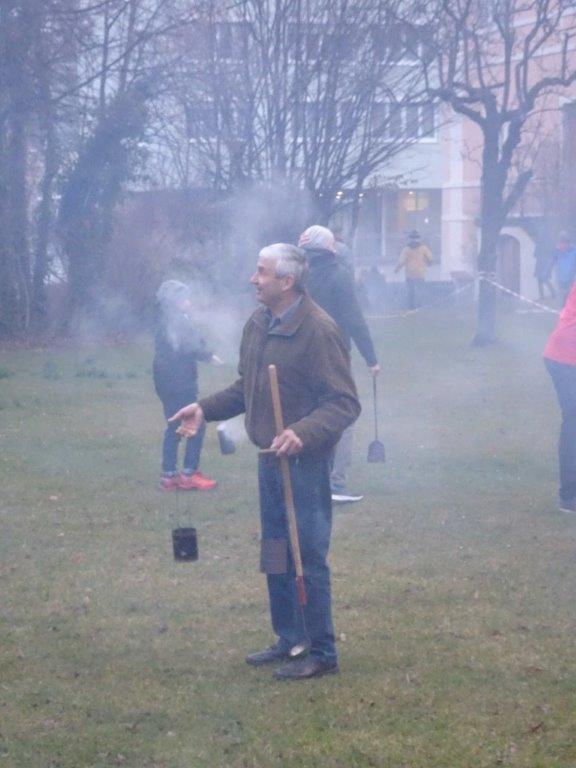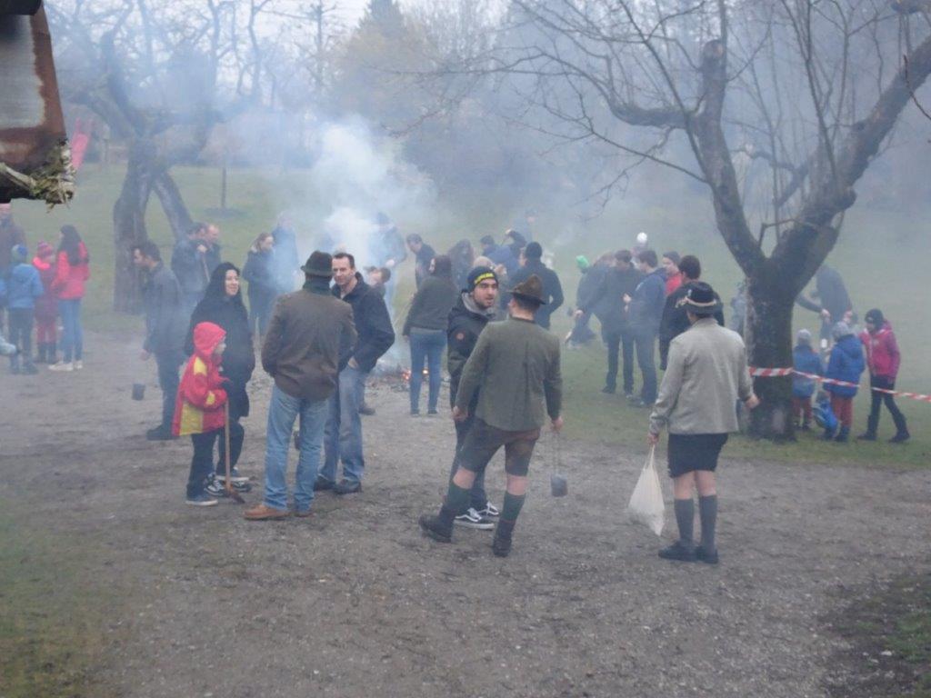 Hierfür wurde ein getrockneter Holzschwamm entweder auf einer Drahtschlinge befestigt oder in ein kleines passendes Metallgefäß gegeben. Dieser Schwamm wurde dann im Feuer vor der Kirche entzündet. Nach der Feuersegnung durch den Pfarrer eilten alle Anwesenden mit ihren rauchenden Schwämmen nach Hause. Dies soll die Bewohner und die Tiere vor Unwetter schützen! Ein schöner Brauch!