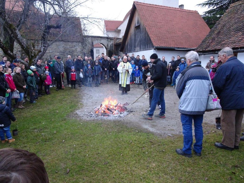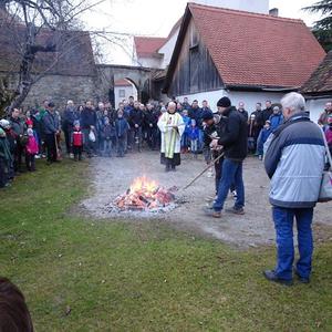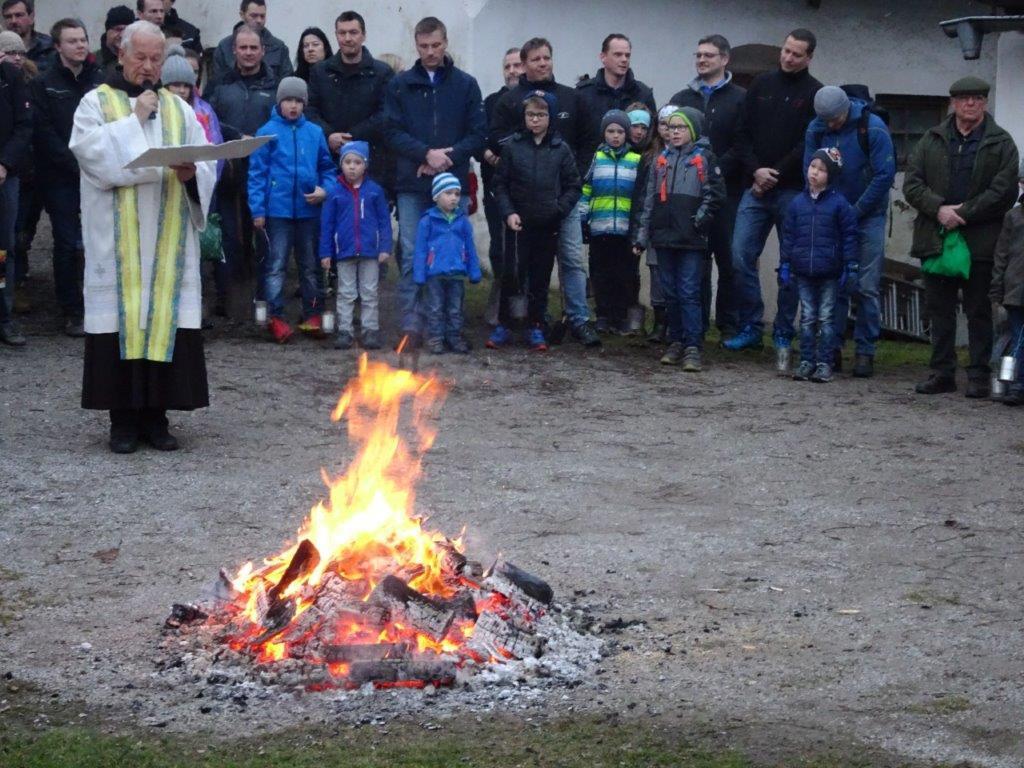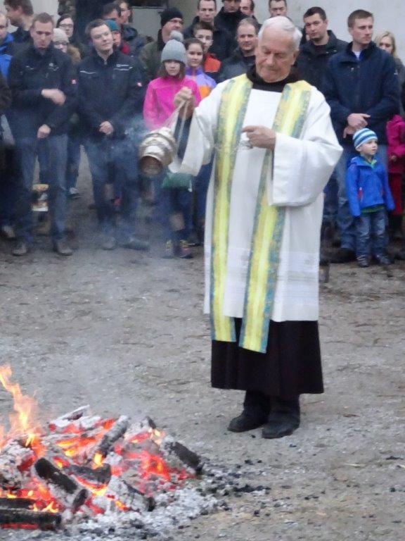 Am Karsamstag um 7 Uhr morgens wurde das Feuer für die Weihfeuerträger im Klostergarten von P. Simon gesegnet. Sehr viele Kinder, Jugendliche, aber auch Erwachsene, darunter auch der Herr Bürgermeister, waren schon so früh unterwegs, um den Gläubigen der Pfarrgemeinde das gesegnete Feuer zu bringen.