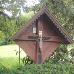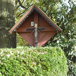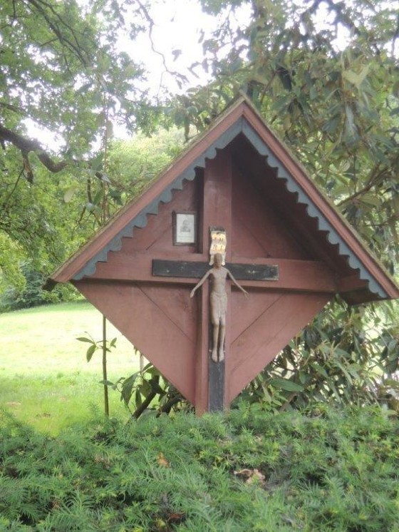 Das Wegkreuz ist auf einem stabilen Betonsockel befestigt. Davor ist ein kugelförmiger Eibe-Wacholder-Strauch gepflanzt, der von Bediensteten des Forstgartens gepflegt wird. Seitlich steht noch ein wolliger Schneeball, ein kräftiger, sommergrüner und weißblühender Strauch.