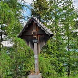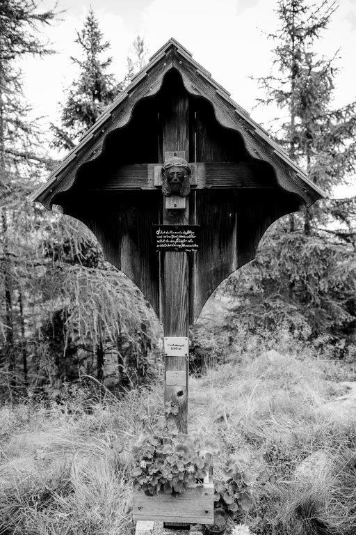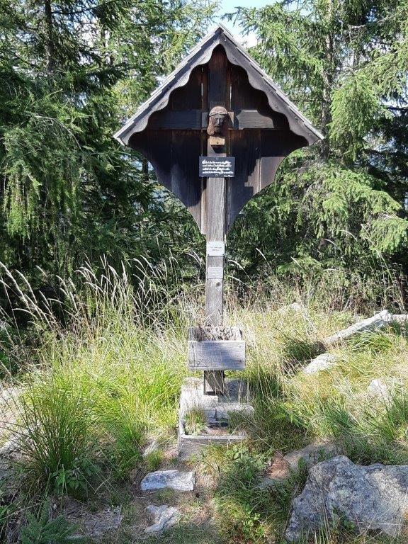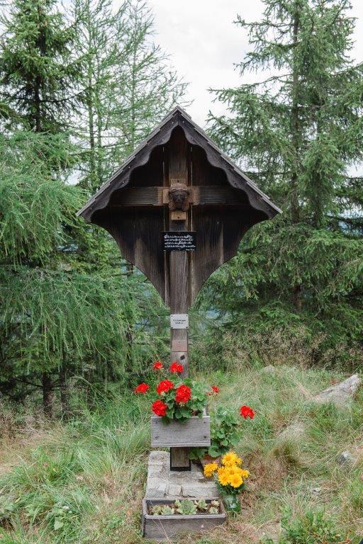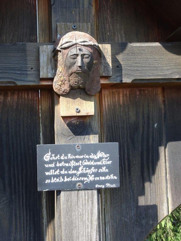 In der Mitte des Kreuzes ist ein Christus-Kopf angebracht, der von Herrn Rumpl vulgo Siegl geschnitzt und gespendet wurde.