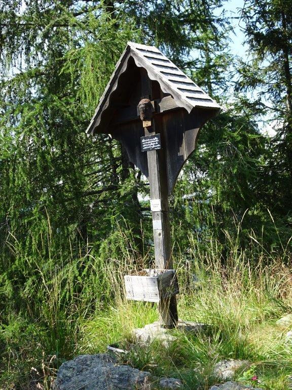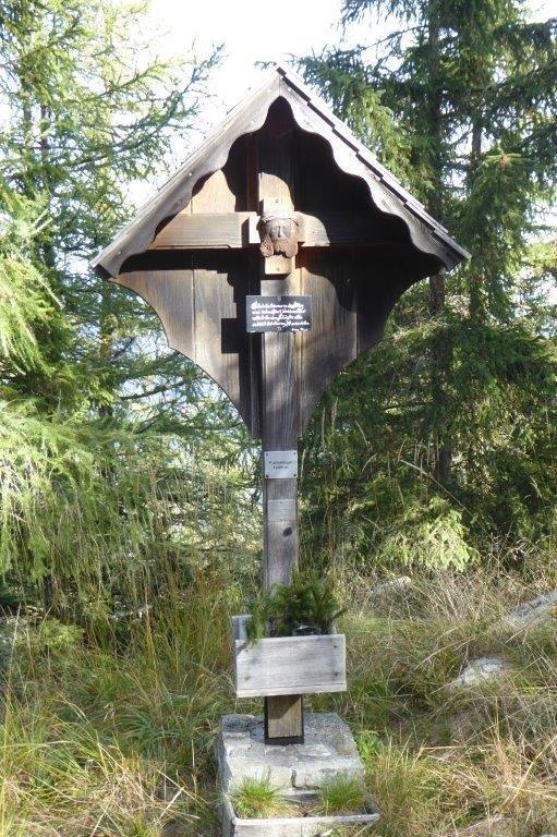 Das Aufstellen eines Kreuzes auf dem Gipfel war ein langgehegter Wunsch des früheren Besitzers Georg Prietl vulgo Fuchs. Leider konnte er die feierliche Segnung nicht mehr miterleben, er war bereits am 8. August 1995 verstorben. Von ihm stammt aber der sinnige Spruch, der auf einer kleinen schwarzen Tafel mit weißer kunstvoller Handschrift am Holzkreuz steht: