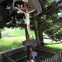 Ein kleiner Holzzaun umschließt dieses Wegkreuz, das noch von riesigen Wacholdersträuchern umgeben ist.