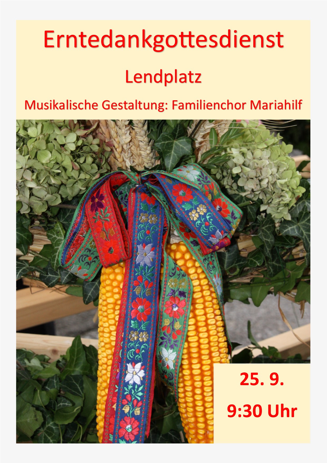 Am Sonntag, den 25. September 2022, um 09:30 Uhr feiern wir unseren Erntedankgottesdienst am Lendplatz. Musikalisch gestaltet wird die heilige Messe vom Familienchor.